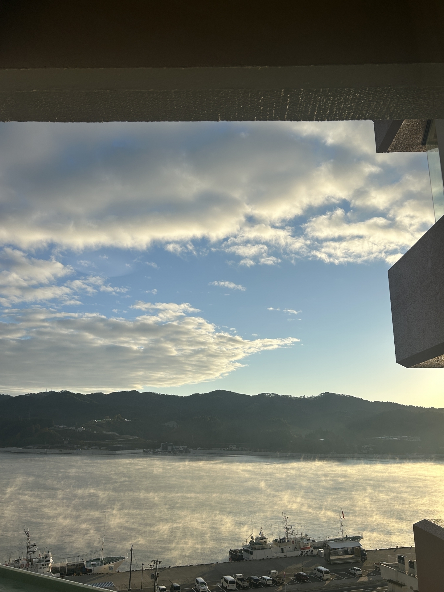 朝5時に温泉に入ろうと早起きして、ホテルの窓を開けると、海面に霧のような波のような何とも不思議な光景が目に飛び込んできました。慌てて、動画と写真を撮り、その時は何だったのかわからず・・。ホテルの方に聞いてみると、この時期だけ一定の条件が整ったときだけに起きる現象だと教えていただきました。